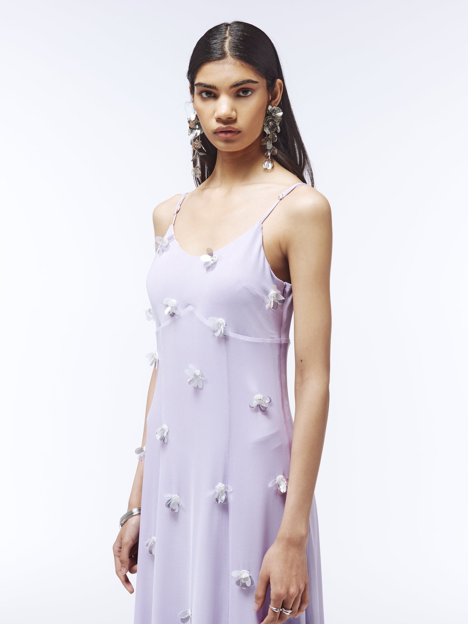 Floral Sequin-Appliqué Tulle Midi Dress in Lavender Purple