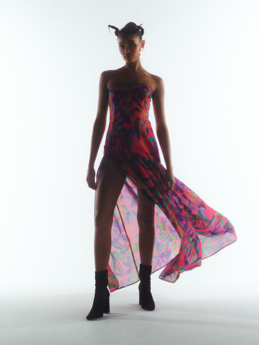 Tropical Print Chiffon Dress in Red Pink