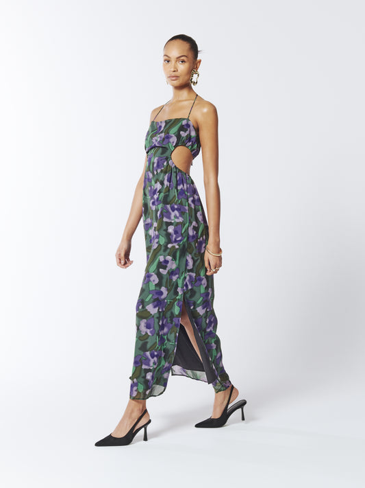 Violette Tie Halter Floral Dress in Purple Comet and Dark Green