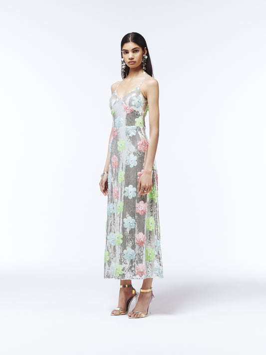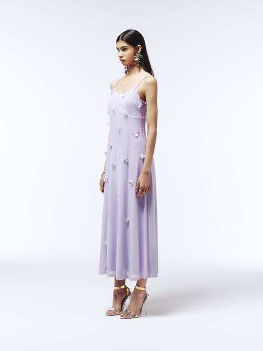 Floral Sequin-Appliqué Tulle Midi Dress in Lavender Purple