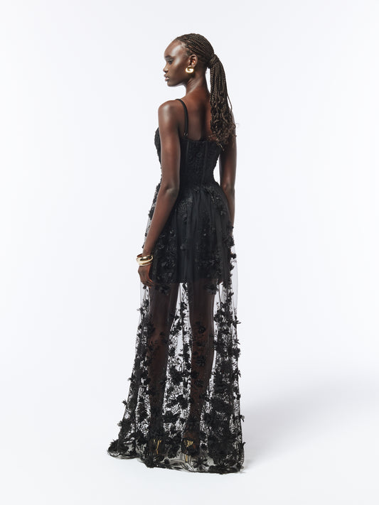 Floral Embroidered Sequin Mesh Evening Dress in Black