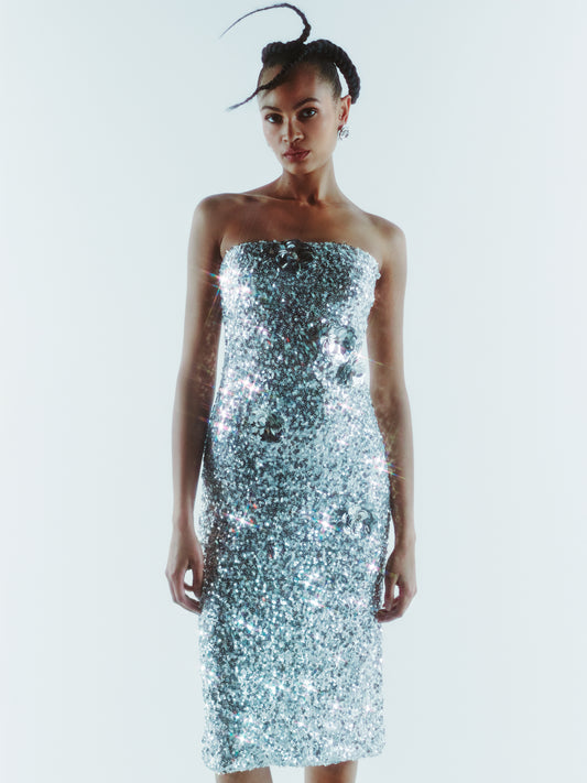 Iridescent Sequin Strapless Midi Dress in Multicolour