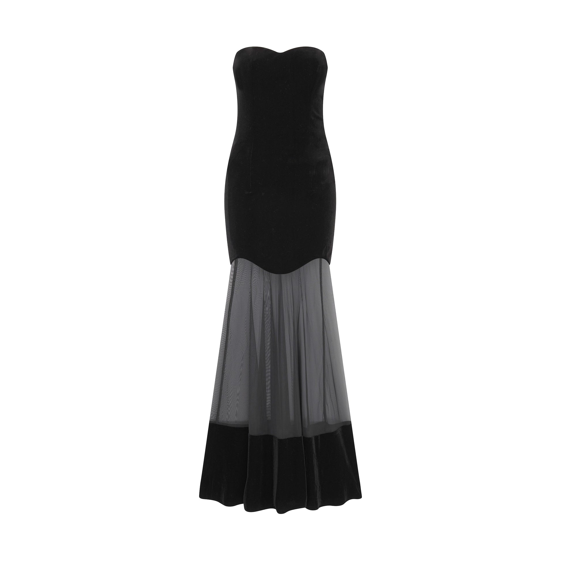 This black velvet evening gown features a sleek silhouette with a bustier, cinched waist, and sheer mesh skirt with velvet end. Finish off the look with a pair of heels for a timeless event outfit.