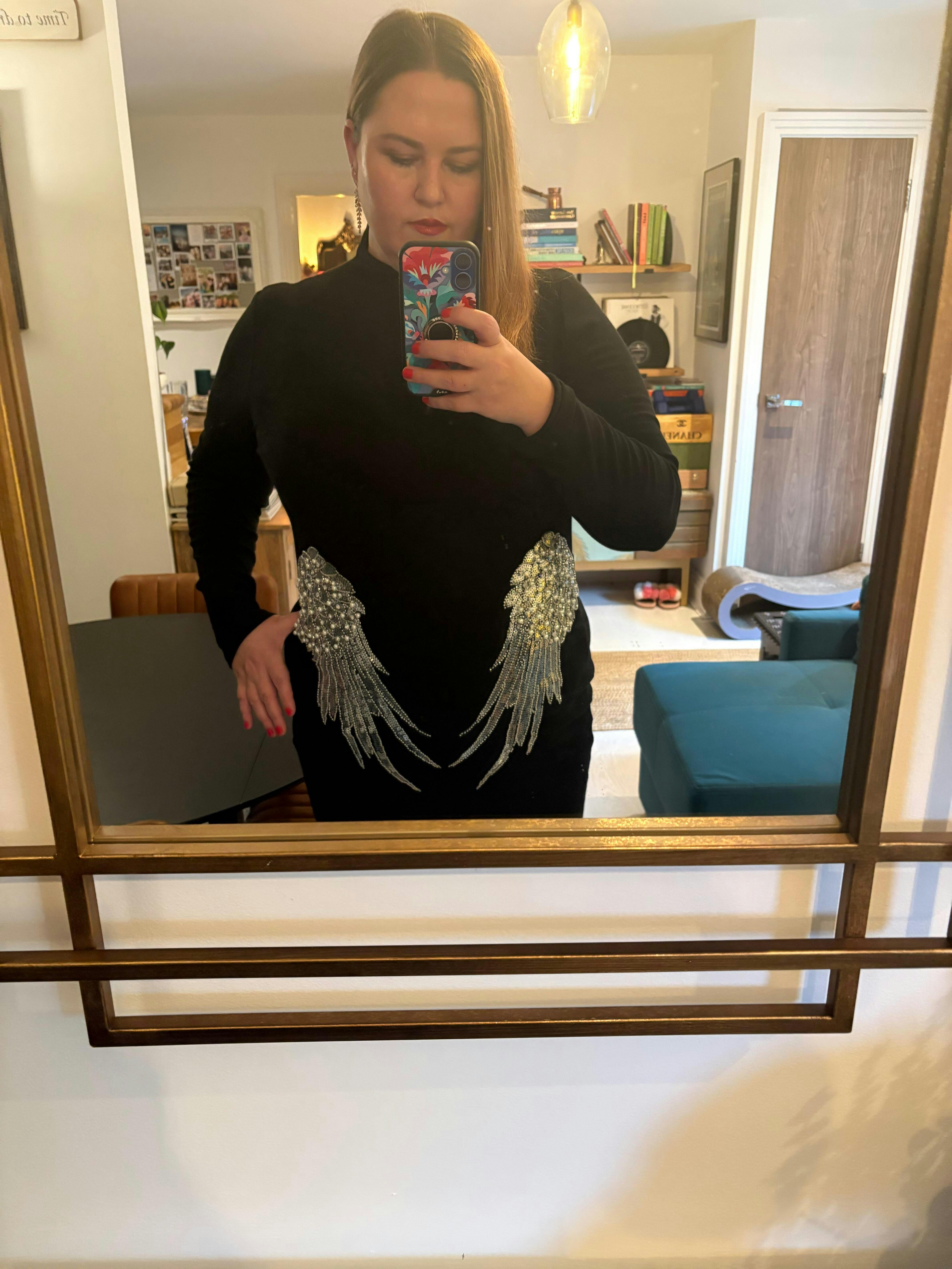 Made with stretch ribbed knit, this black gown sculpts gracefully through the body before flaring slightly at the hem. The crystal and sequin embellishments form dramatic wing motifs, catching the light with every movement. The clean back and long sleeves balance the intricate detailing, making it an elegant choice for evening occasions.