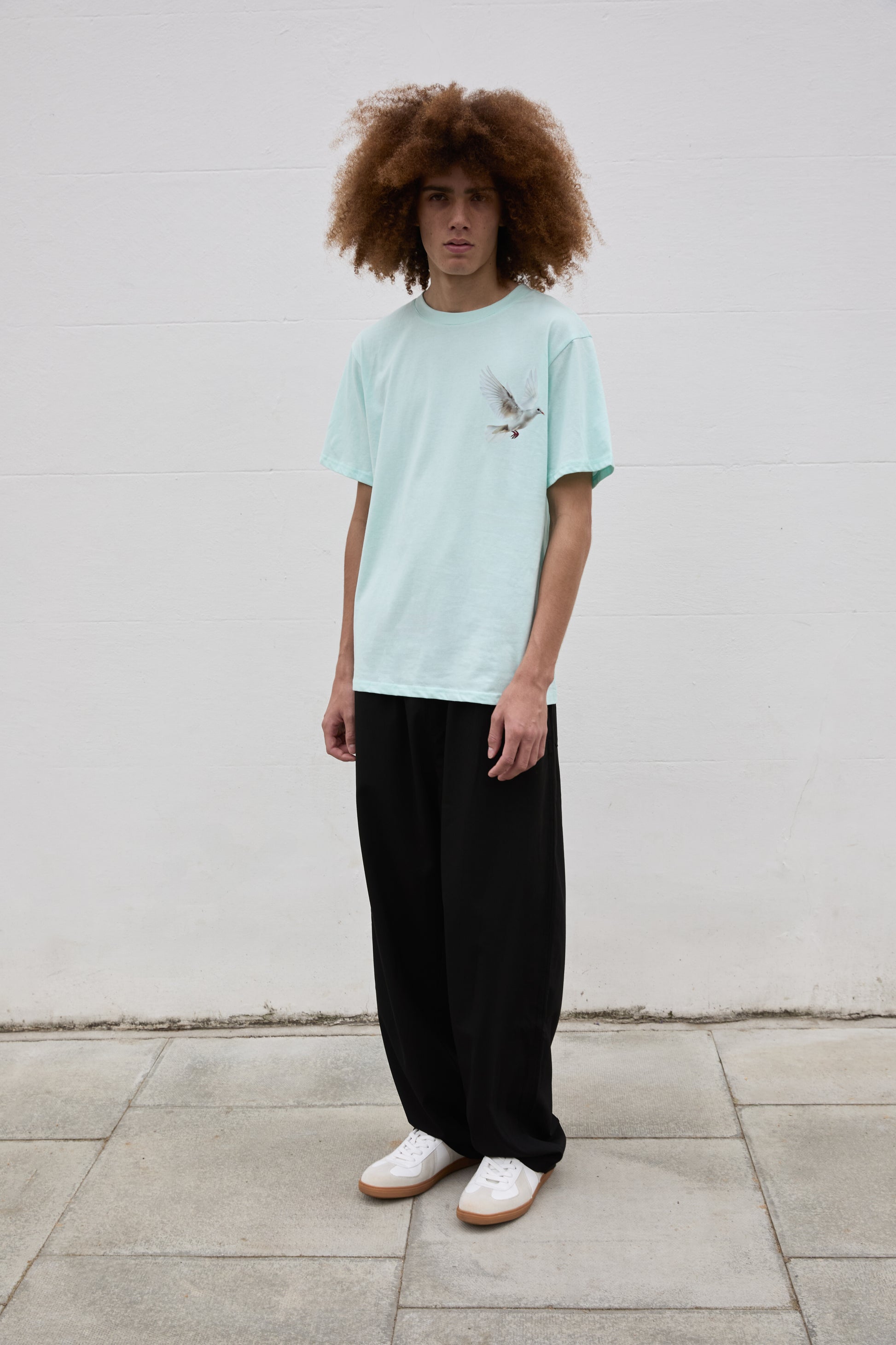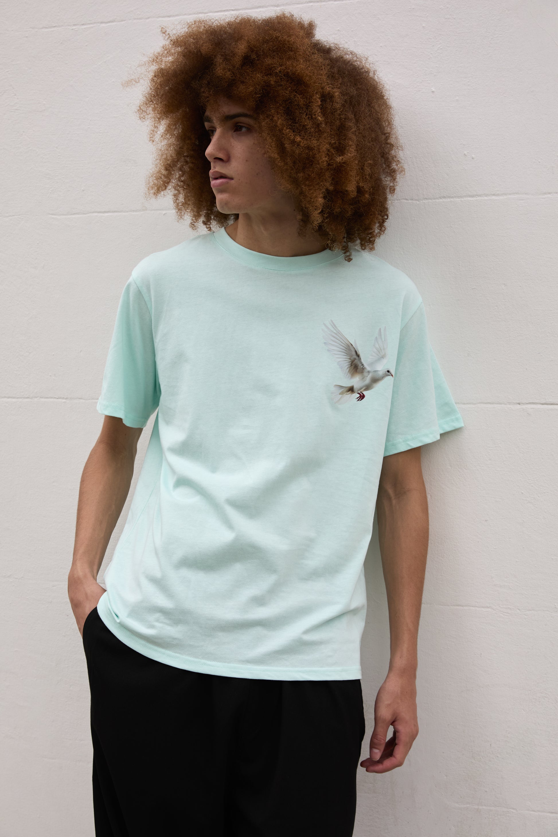 SOUR FIGS light mint green t-shirt is crafted from premium cotton, detailed with flying dove print. Cut to a relaxed unisex fit with a ribbed crew neck.