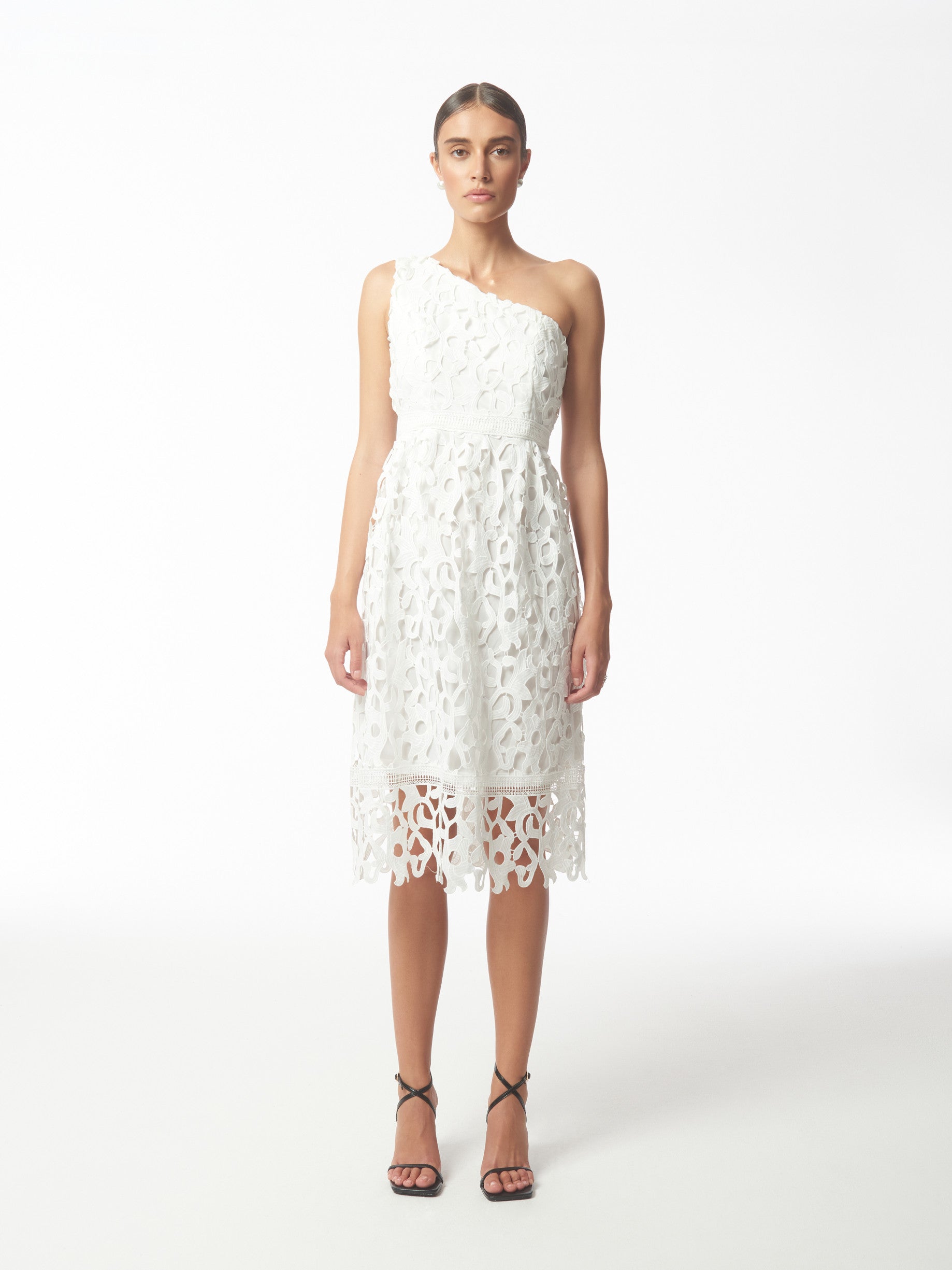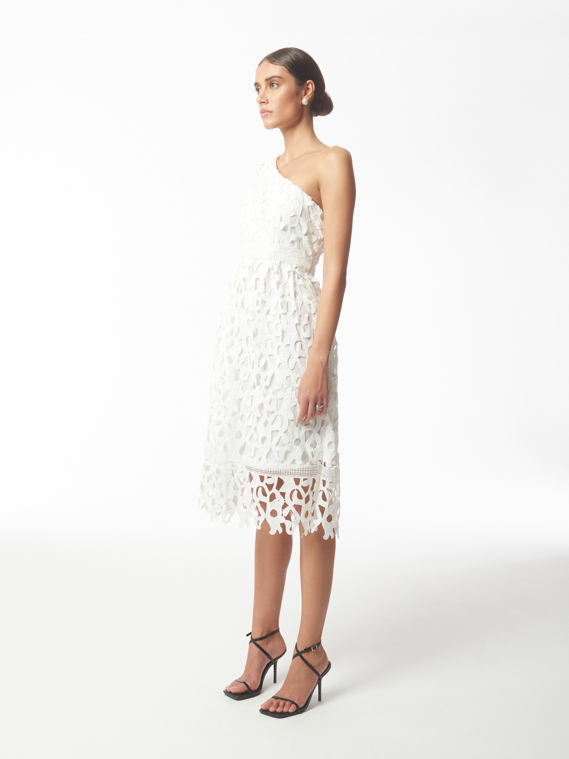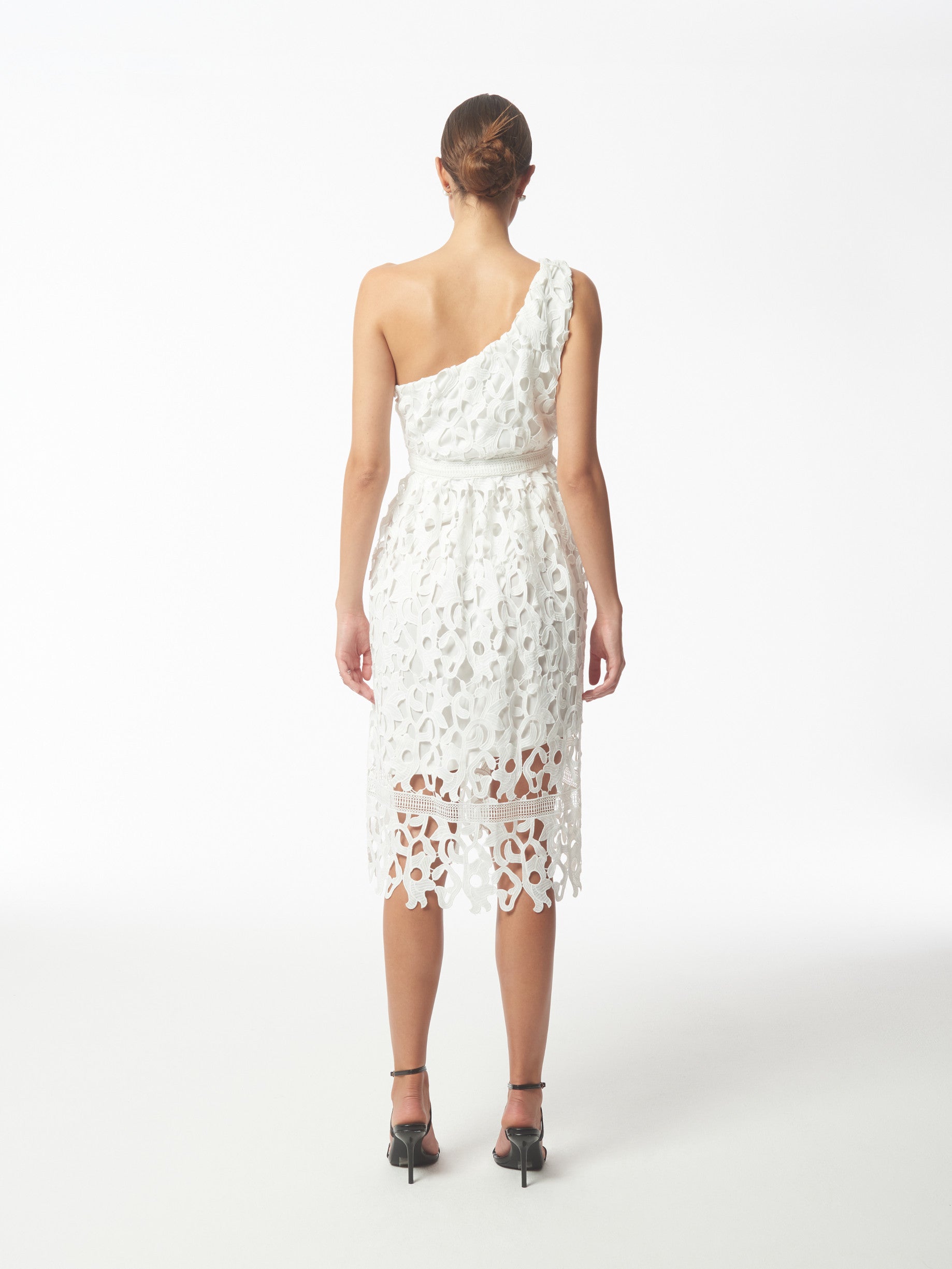 Created in white and adorned with guipure lace, this asymmetric dress is as timeless as they come. It features a sleek silhouette, while the fitted waist and the midi skirt add a touch of sophistication. Complete the look with stilettos for a long-awaited event.  Also available in misty rose pink.