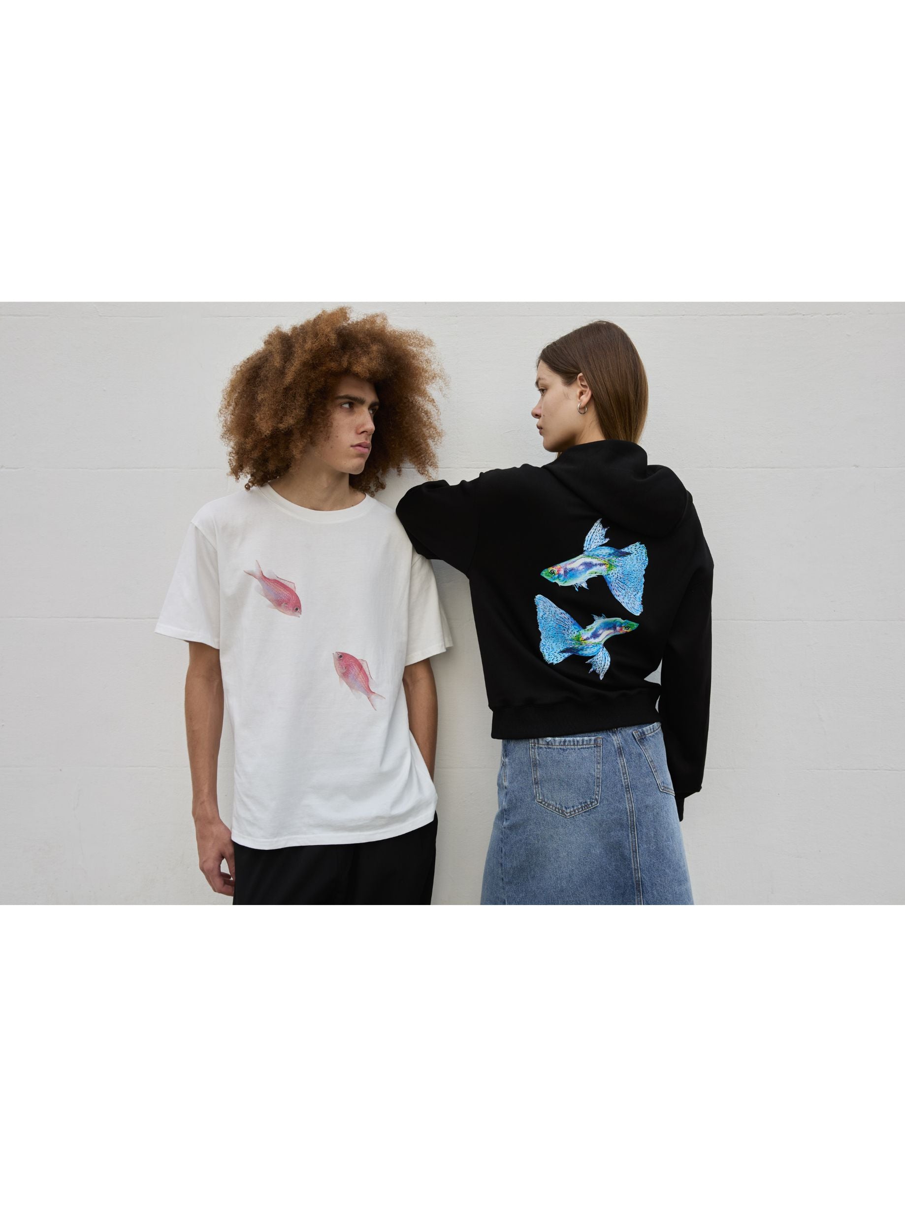 SOUR FIGS white t-shirt is crafted from premium cotton, detailed with pink maomao fish duo print. Cut to a relaxed unisex fit with a ribbed crew neck.