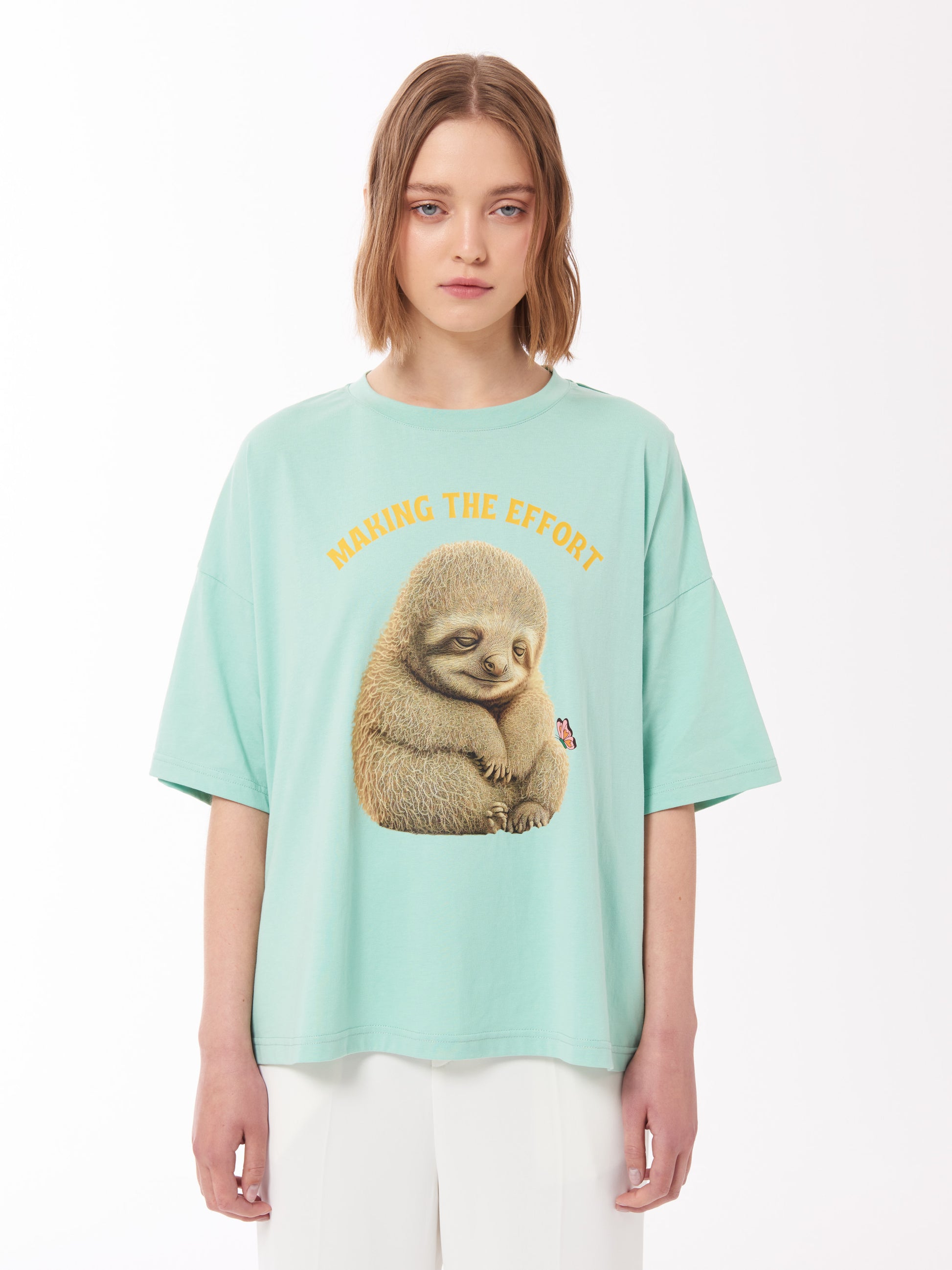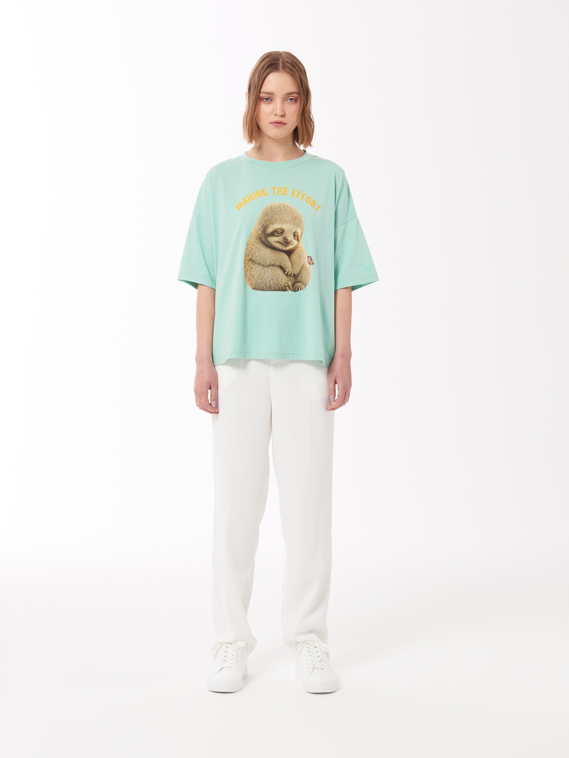 SOUR FIGS Light Mint Green T-Shirt is crafted from premium cotton, detailed with a sloth print animation. Cut to a relaxed unisex fit with a ribbed crew neck.